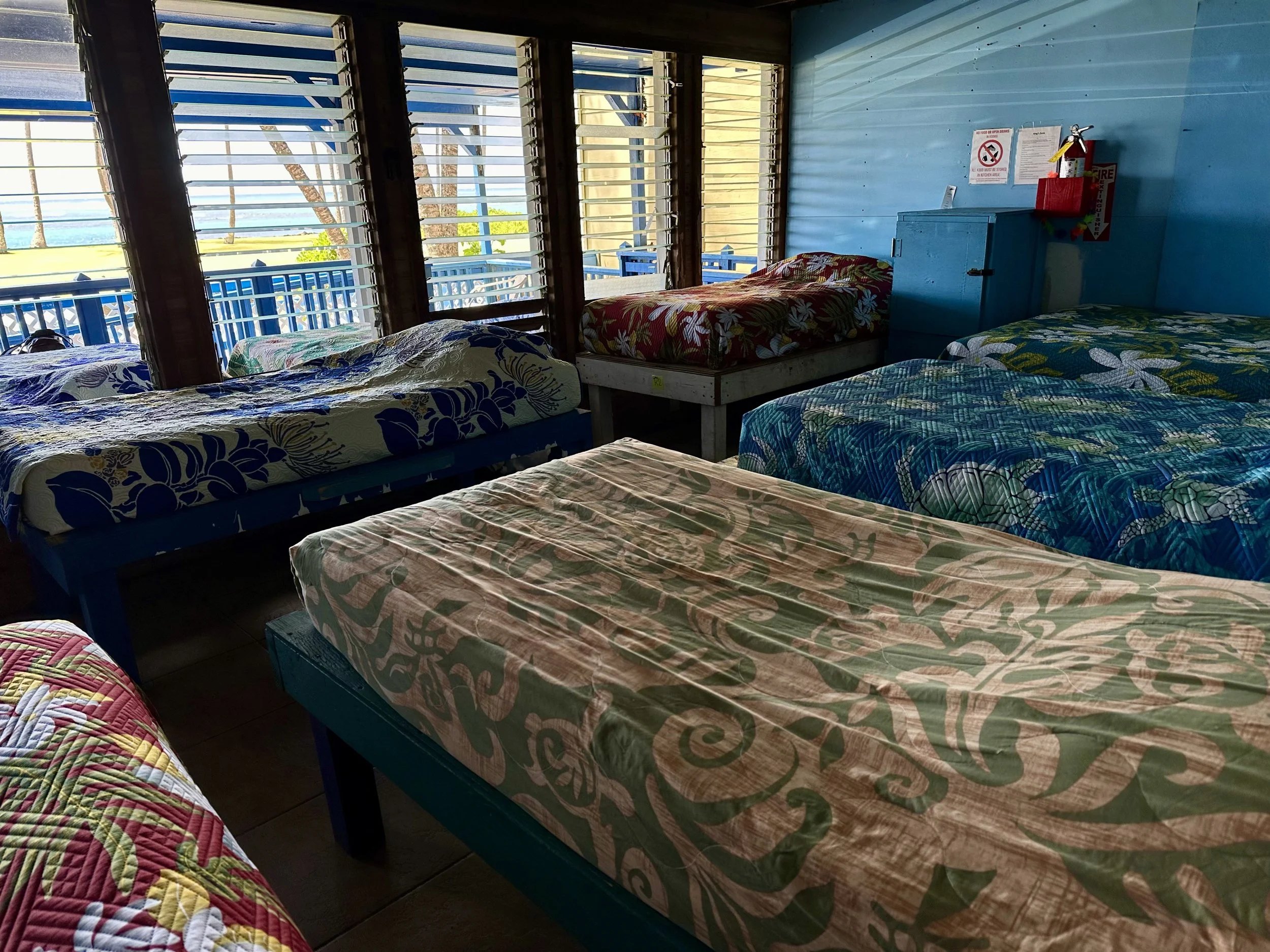 This unique mixed-gender dorm features 3 single beds located on our covered outdoor lanai — offering a one-of-a-kind island experience.